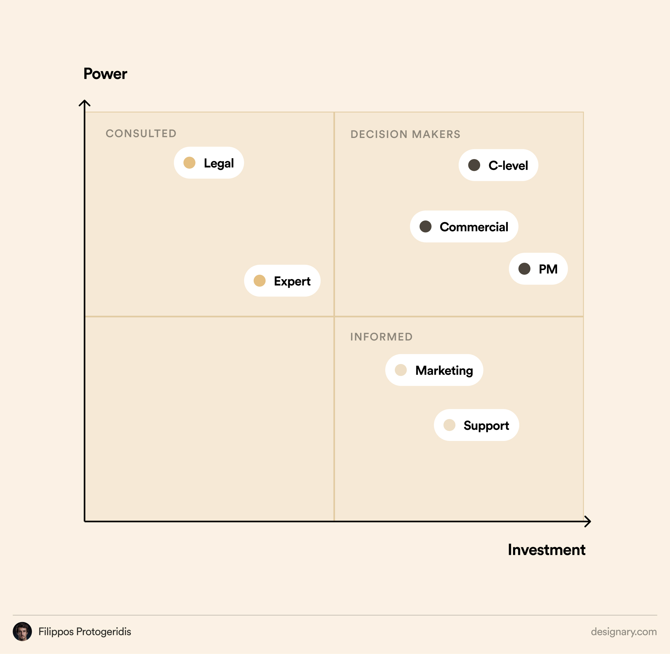 Consulted: These are people that you need to consult before making a decision. Think legal, risk, brand and so on. They won’t be invested in their day to day, but may have a lot of power in influencing a decision, and usually have the ability to completely block an initiative or a specific solution.