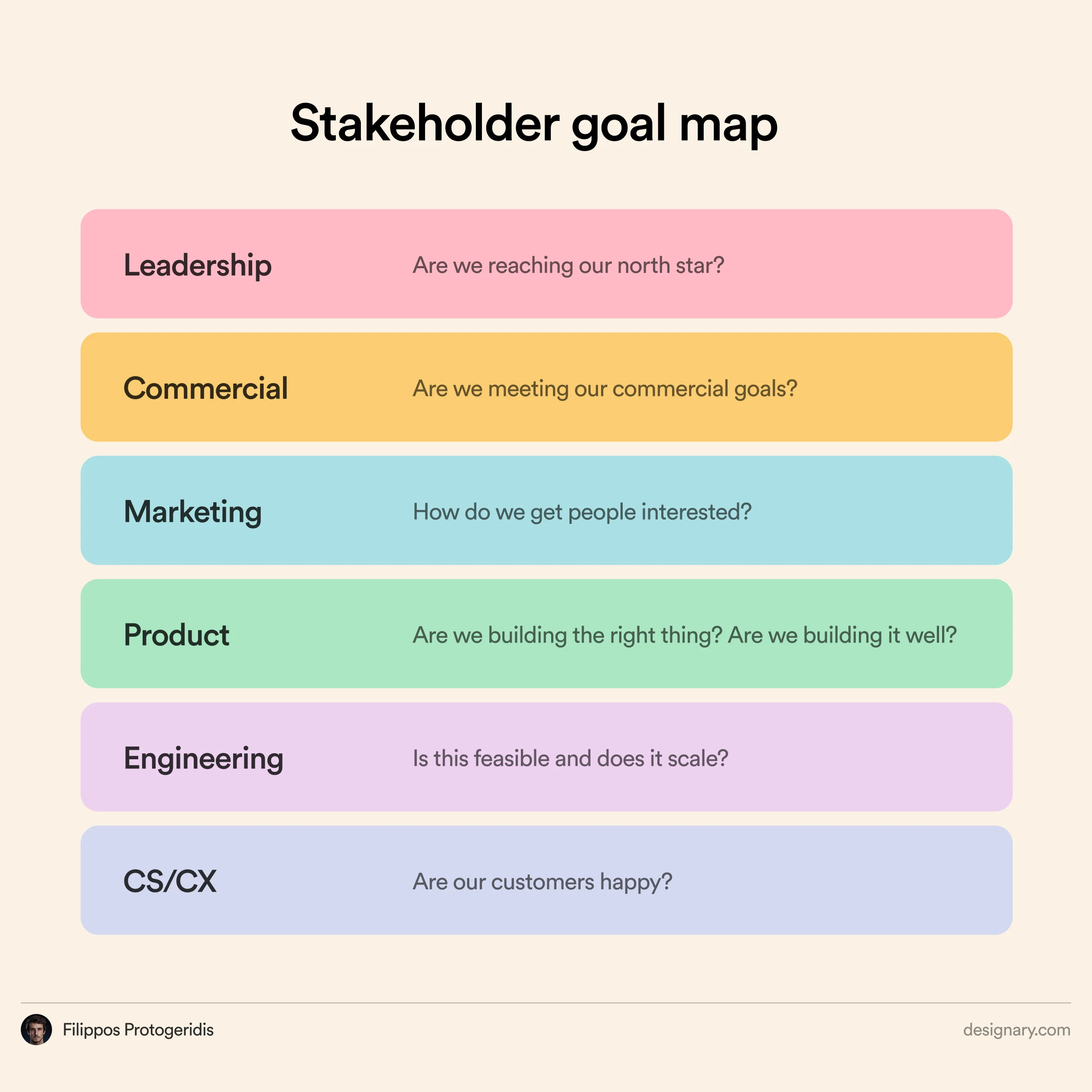 In some teams, the Product Manager and Engineering Lead might also be considered stakeholders, albeit in most cases they will (and should) be working with you on a day-to-day basis as part of a squad or pod. So for the sake of simplicity, I’m not including them in the list of common stakeholders.