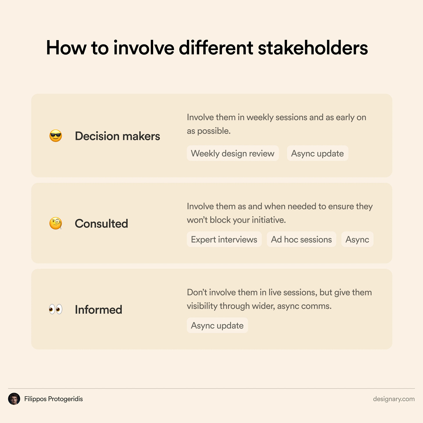 Informed: Most communication with stakeholders that simply need visibility can be asynchronous and as simple as a Slack message or email. You may choose to involve them in wider sharing sessions once in a while, particularly to give your wider team visibility on what’s being worked on.